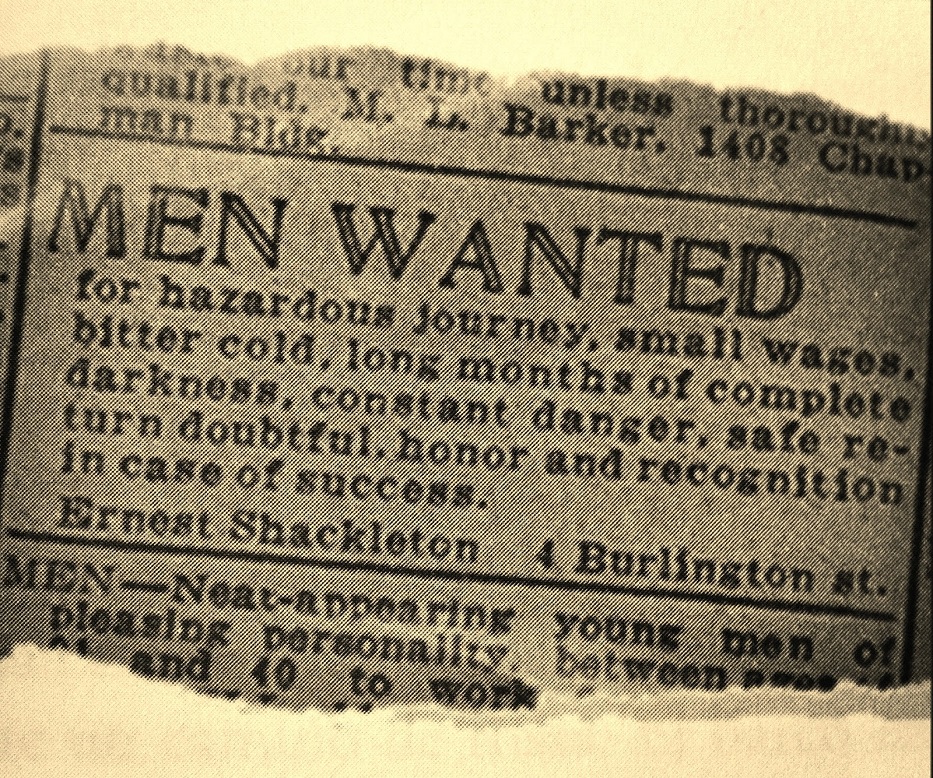 Shackleton reclutó su equipo expediconario mediante un original anuncio clasificado. Prometía "un viaje peligroso, pagas muy bajas, un frío terrible y largos meses de oscuridad" así como "un retorno seguro más que dudoso". En contrapartida, aseguraba "honor y reconocimiento en caso de éxito".