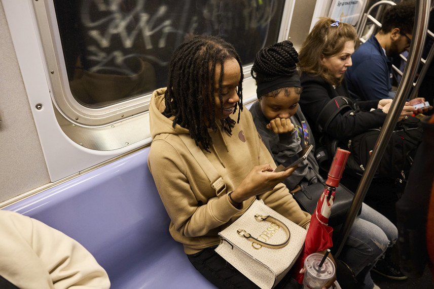 "No me gusta que la gente mire mis cosas", dijo Shanaisa O'Neal, que una tarde reciente, mientras viajaba en el tren F de Manhattan con su hija, miraba su teléfono con la pantalla visible solo para ella.