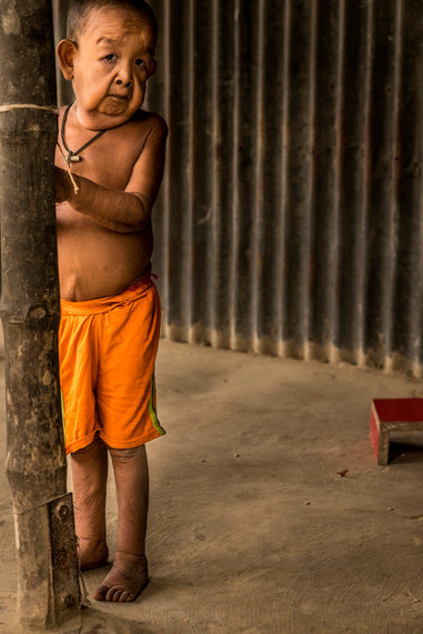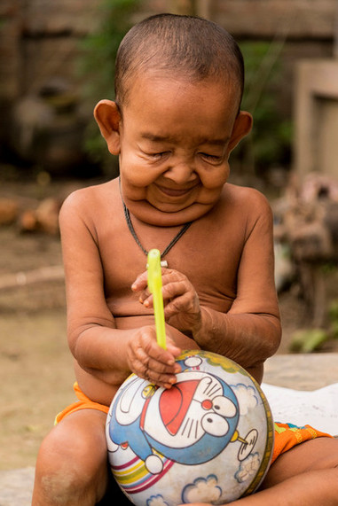 El niño nació con un exceso de piel, que cuelga de sus miembros y de su cara, lo que le confiere una imagen de anciano. También sufre problemas cardíacos, de audición y de vista.