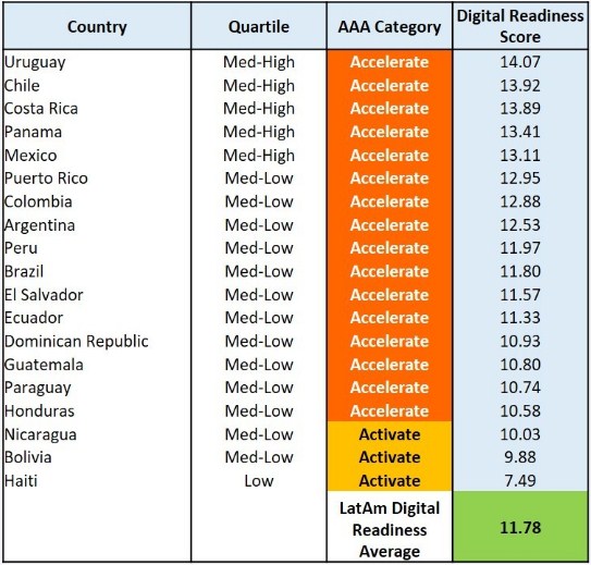 El promedio global de preparación digital es de 11.96, también muy por debajo de Uruguay, a quien en Latinoamérica le siguen el ya mencionado Chile y luego Costa Rica, Panamá, México, Puerto Rico, Colombia, Argentina, Perú y Brasil.