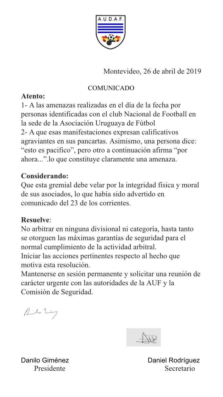 El detonante que llevó a la decisión fue la manifestación en la sede de la AUF de la agrupación "Guardianes de Nacional", que mostró pancartas que decían: "Jueces ladrones dejen de robar a Nacional", "Ubriaco (miembro del Colegio de Árbitros) hijo de puta, sacate la rayada" y la tercera decía: "AUF cueva de corruptos y ladrones".