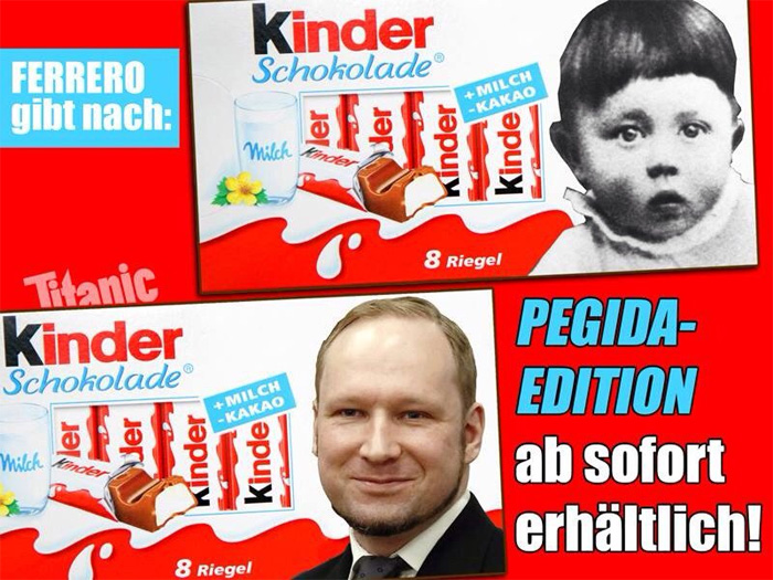 Entre los comentarios se incluyeron imágenes modificadas del paquete de 'Kinderschokolade' como, por ejemplo, una en la que se podía leer Herren Schokolade junto a la imagen de un supuesto Hitler bebé y barritas sólo de color blanco u otra en la que escribieron “Pegida Schokolade. Con leche de vacas alemanas y sin aditivos extranjeros. Ocho barritas, tan blancas por dentro como un verdadero alemán”.