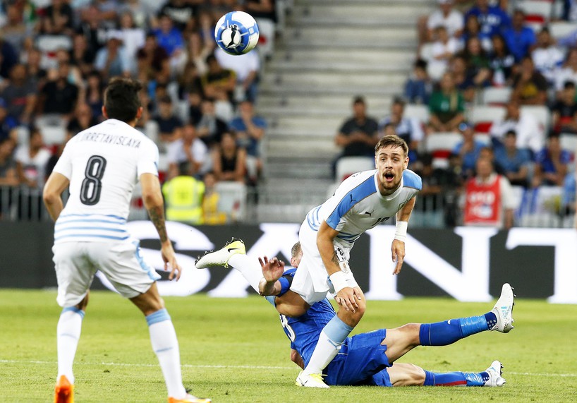 El encuentro comenzó de la peor manera para la Celeste, que a los 7’ ya estaba en desventaja. Insigne encontró a Belotti en largo, a espalda de Giménez, y el zaguero uruguayo en su afán por despejar terminó batiendo el arco defendido por Muslera con un remate inatajable. Tras el gol, el control del juego siguió siendo de los azules, que propusieron más a partir de la tenencia de la pelota y mostraron un renovado estilo.