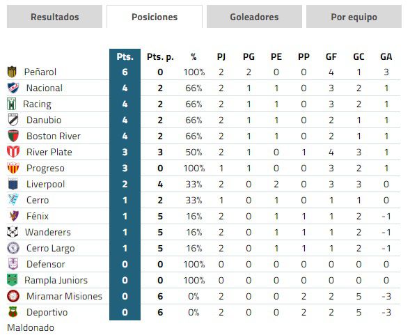 Peñarol es el único equipo que lidera con seis puntos tras dos fechas del Torneo Clausura, luego de ganarle a Miramar Misiones 2-0 el pasado sábado como local. No obstante, los carboneros no son los únicos con puntaje perfecto.
