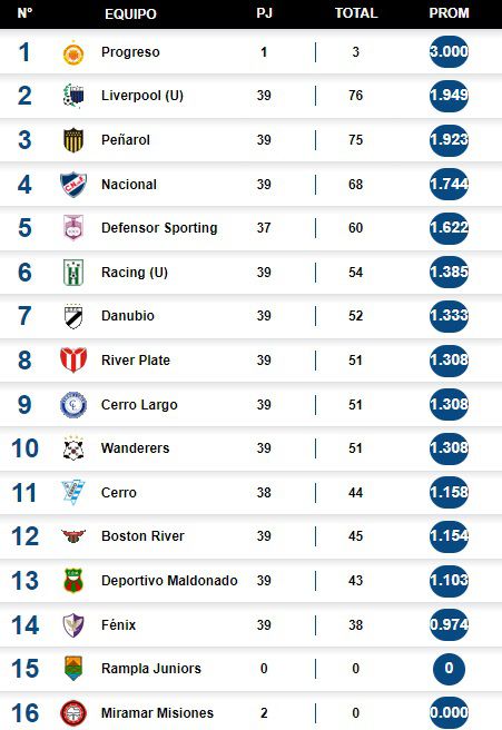 En la siguiente TABLA DE POSICIONES todavía no se registran los tres puntos de Defensor Sporting ante Cerro, pero hay que darlos por hecho.