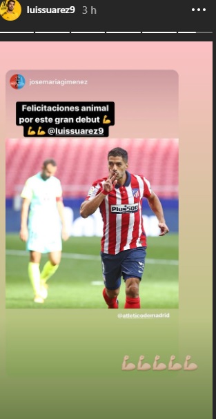 El zaguero comparte equipo con Suárez en el Atlético de Madrid y en la selección uruguaya, pero no estuvo en el debut del salteño debido a que posee COVID-19. Sin embargo, no quiso quedarse afuera de saludarlo por su primer partido en el Wanda Metropolitano como nuevo futbolista "Colchonero".