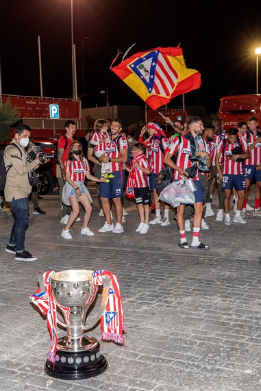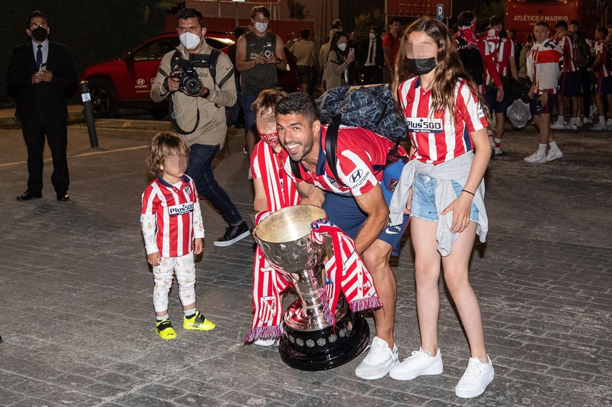 Al volver a Madrid, el futbolista de la selección uruguaya pudo celebrar un poco con los todos hinchas. Tal es así que les mostró la copa a los simpatizantes del Colchonero, y lo hizo acompañado por sus tres hijos.