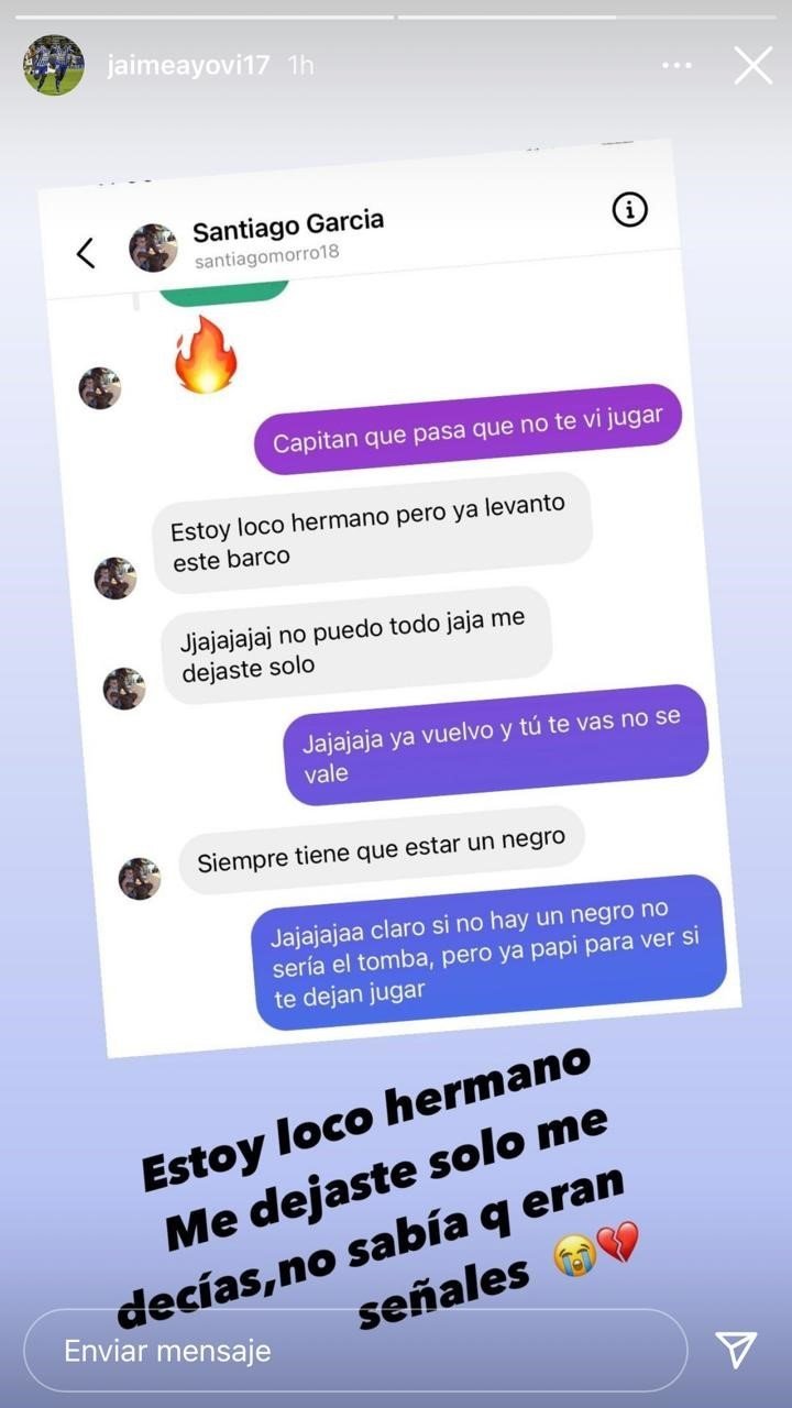 El delantero surgido de las inferiores de Nacional le contestó: "Estoy loco hermano pero ya levanto este barco. Jajaja, no puedo todo jaja, me dejaste solo". Ayoví le respondió: "Jajaja, Ya vuelvo y tú te vas, no se vale".