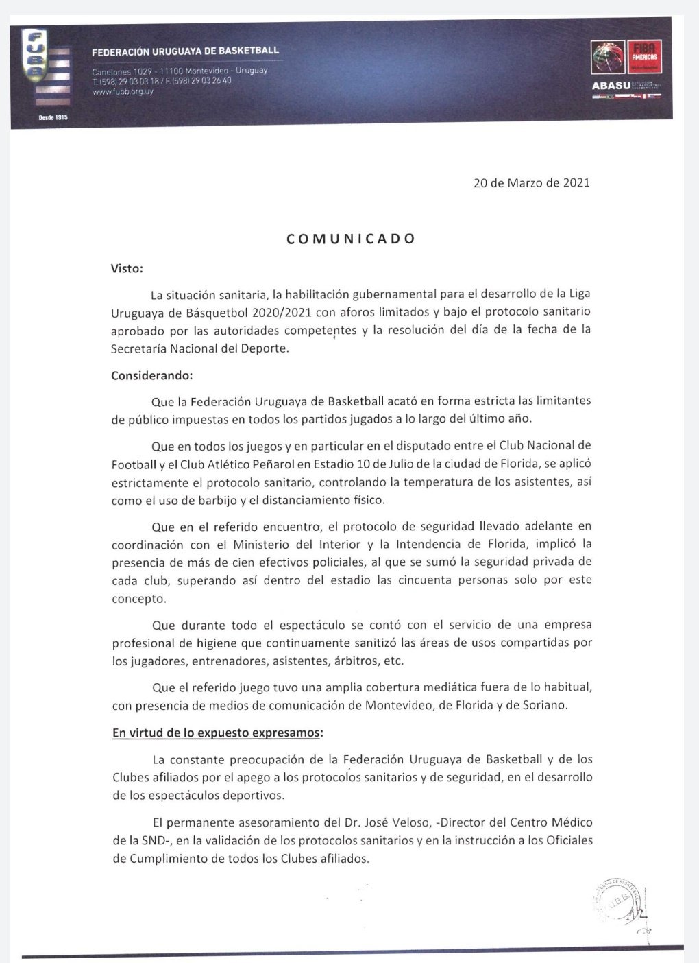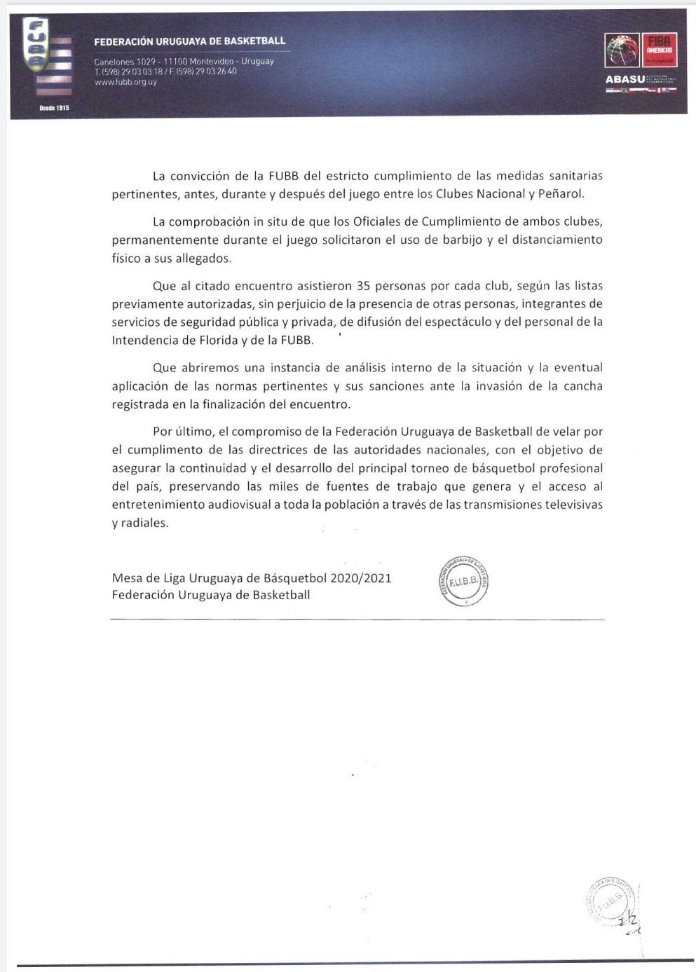 Además, se recordó que hubo “presencia de medios de Montevideo, Florida y Soriano”, muy por encima de lo habitual, y se ratificó “la convicción de la FUBB del estricto cumplimiento de las medidas sanitarias pertinentes, antes, durante y después del juego entre Nacional y Peñarol”.