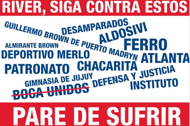 Luego del clásico de ayer, los carteles sacaron a relucir la inteligencia de la afición, que volvió a usar como recurso al autor del gol, Pablo Mouche, a la hinchada denominada "los Borrachos del Tablón", y a la paternidad que entienden que ejercen sobre River.