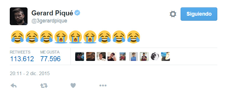 No conforme con la repercusión de sus emoticones, Piqué mantuvo su estilo y redobló la apuesta a través de la misma red social un par de días después, cuando citó su propio tuit y se preguntó: “más de 100.000 retuits sin decir una palabra. ¿Es un nuevo récord en @twitter?