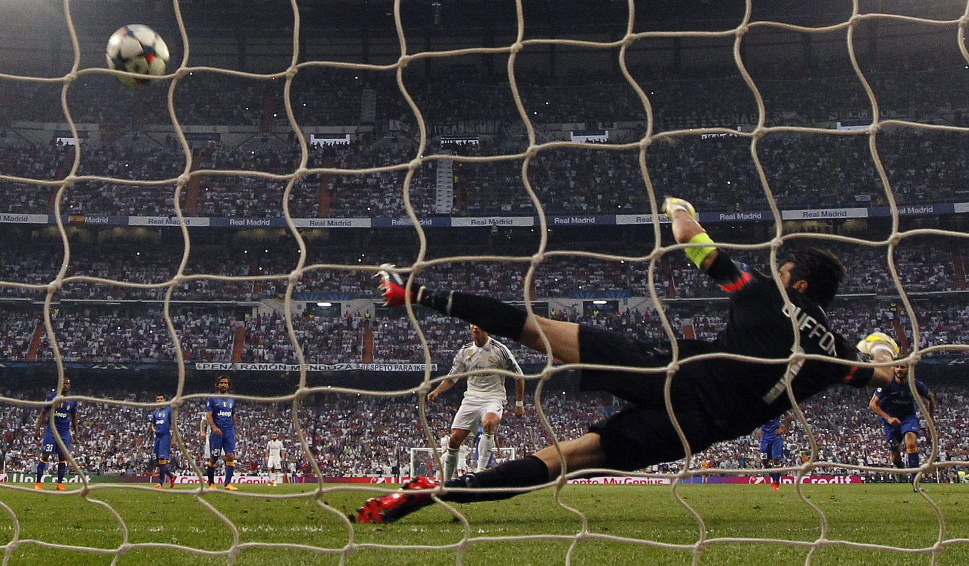 Pese a no ir a buscar el partido tan arriba, los dirigidos por Ancelotti siguieron exigiendo a Buffon y lo transformaron en figura en el último cuarto de hora de la primera mitad. Primero el arquero del campeón italiano se quedó con un cabezazo de Benzema, luego con un remate de Cristiano Ronaldo y después con un zurdazo rasante de Benzema que se le metía bien abajo en el primer caño.