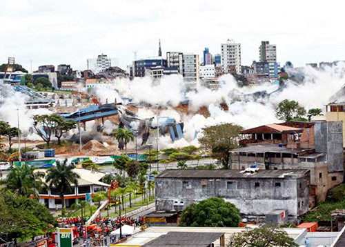 Los artificieros utilizaron cerca de 700 kilogramos de explosivos de gel para destruir en unos 15 segundos el graderío superior del estadio y los 138 pilares que sustentaban la cubierta, según informó la gobernación del estado de Bahía.