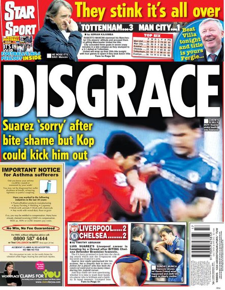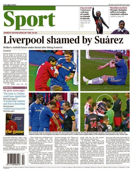 Por su parte, el apartado deportivo de The Times, Sport, tituló "Liverpool avergonzado por Suárez", agregando: "El futuro del delantero de Anfield bajo amenaza tras morder a Ivanovic".