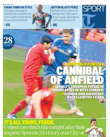 Por su parte Sport, el suplemento deportivo del Daily Telegraph, encabezó con "Canibal de Anfield", aclarando que "el futuro de Suárez en Liverpool está en duda tras su mordida a Ivanovic", y "el delantero se disculpó pero enfrentará larga sanción de la FA", en referencia al órgano rector del fútbol inglés, la Football Association.