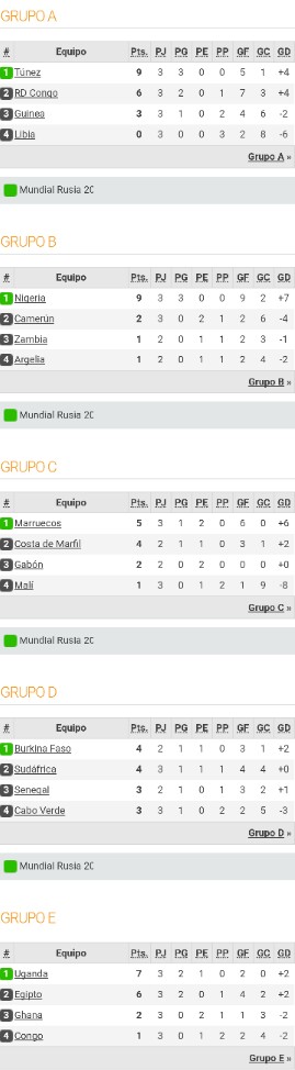 Por el grupo "C" en tanto, Cabo Verde le ganó 2-1 a Sudáfrica y Marruecos subió al primer puesto de la zona C al derrotar a 6 a 0 a Mali, dejando atrás a Costa de Marfil y Gabón, que se enfrentarán el sábado.
