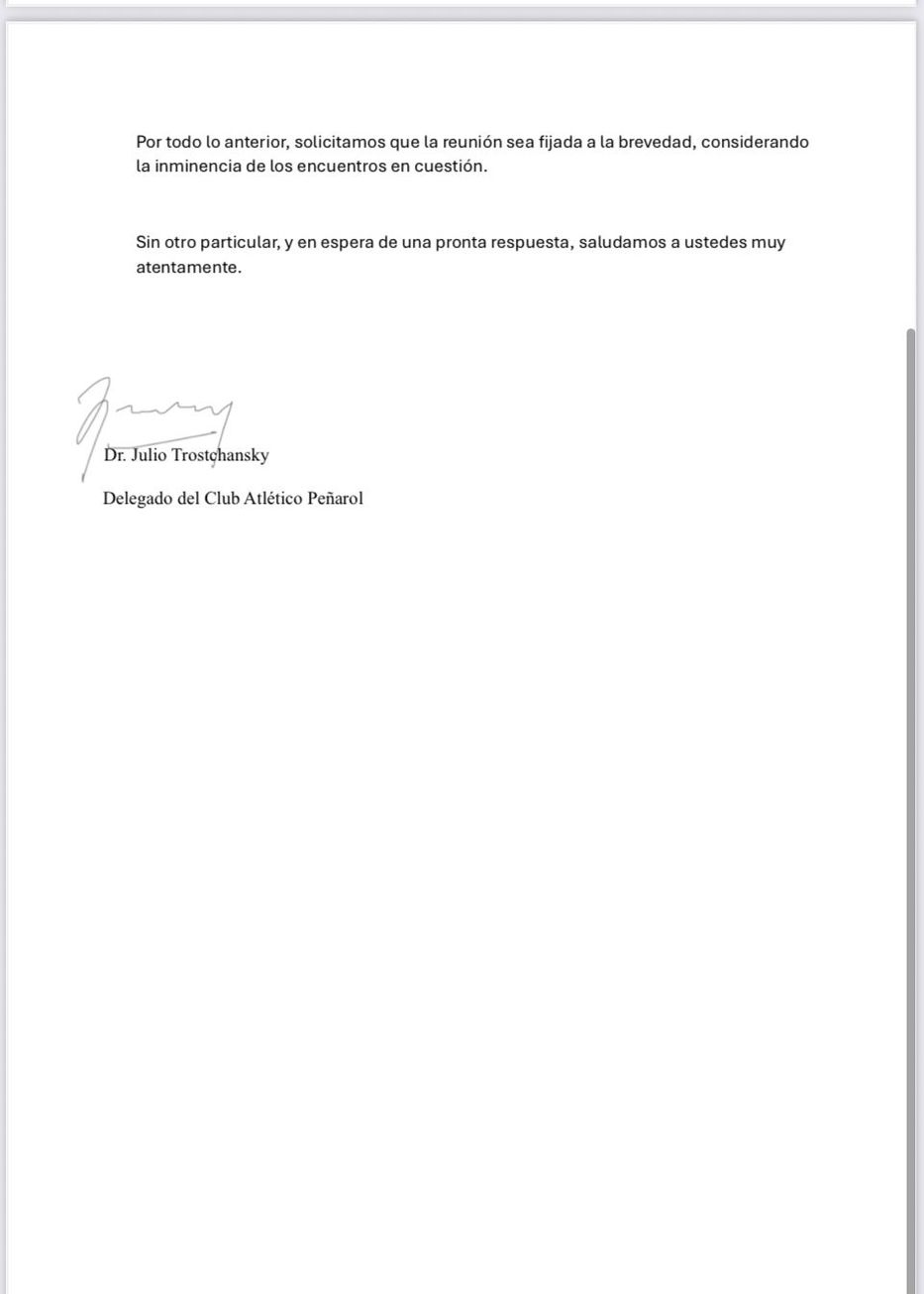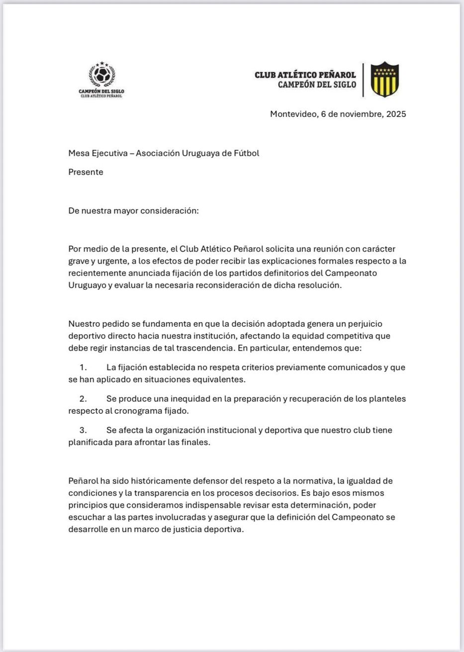 Debido a esta situación, Peñarol solicitó “una reunión con carácter grave y urgente” con Mesa Ejecutiva, “a los efectos de poder recibir las explicaciones formales” respecto a la fijación de los partidos definitorios.