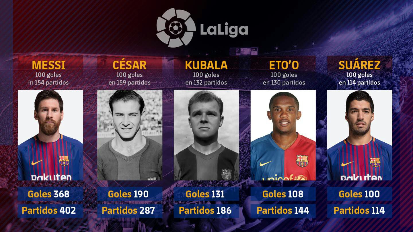 Hasta ayer, solo cuatro futbolistas eran goleadores centenarios del campeonato liguero vistiendo la camiseta azulgrana: César Rodríguez, Ladislao Kubala, Samuel Eto'o y, por supuesto, Lionel Messi.