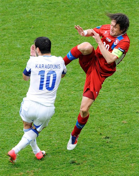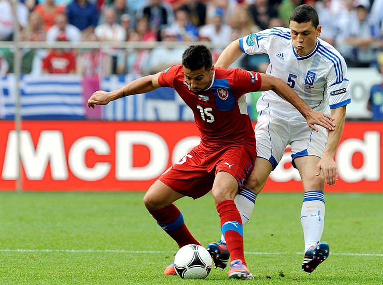Le costó demasiado tiempo reaccionar a Grecia, que a los 22’ sufrió la lesión de su arquero Chalkias y en su lugar ingresó Sifakis. Poco después de su entrada, fue llamado a actuar por un disparo potente de Rosicky, la manija de los checos, que terminó enviando al corner. El elenco helénico manejó mejor la pelota, pero casi no generó peligro en la primera mitad. La única clara que generó terminó en gol bien invalidado por posición adelantada.