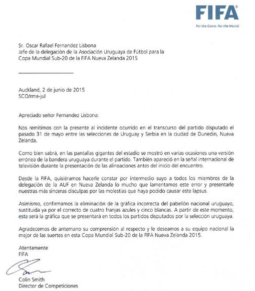 El documento, firmado por el Director de Competiciones, Colin Smith, sostiene: "agradecemos de antemano su comprensión" y cierra lo escrito diciendo: "le deseamos a su equipo nacional la mejor de las suertes en esta Copa Mundial Sub-20 de la FIFA Nueva Zelanda 2015".