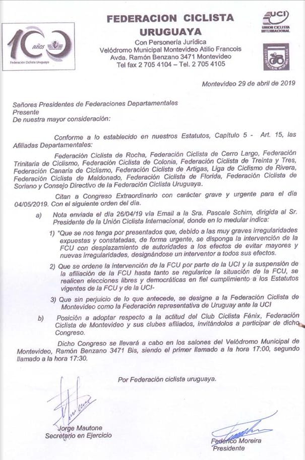 La Federación Ciclista Uruguaya (FCU) citó a un Congreso Nacional Extraordinario en carácter de grave y urgente a causa del pedido y comunicación de la Federación de Montevideo y el Club Ciclista Fénix a la Unión Ciclista Internacional (UCI) del pedido de la intervención de la primera.