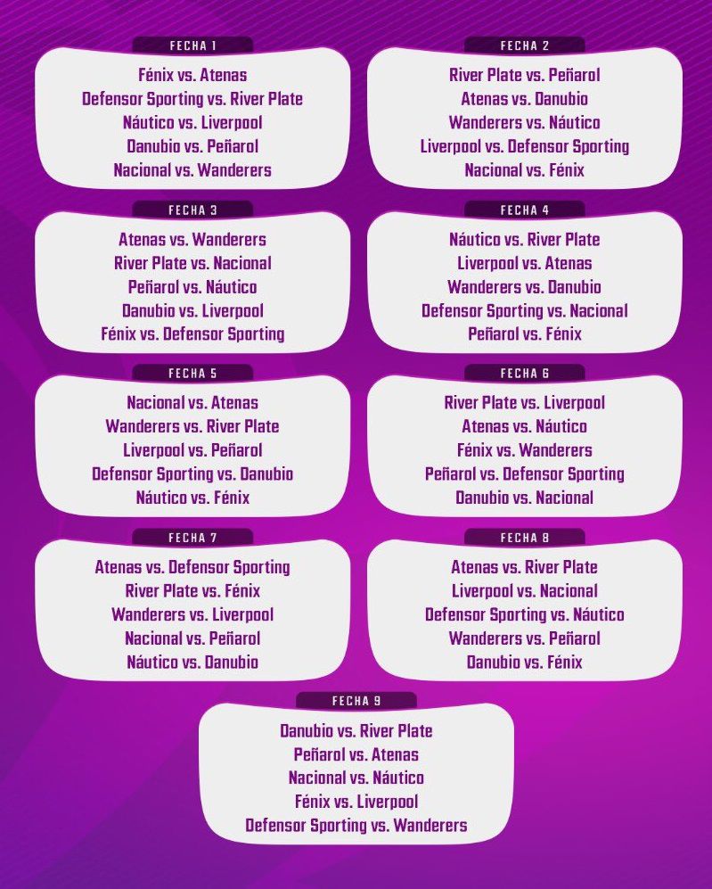 En la primera fecha Defensor Sporting iniciará la defensa de su título recibiendo a River Plate, mientras que Nacional será local ante Wanderers, Danubio frente a Peñarol, Náutico ante Liverpool y Fénix contra Atenas.