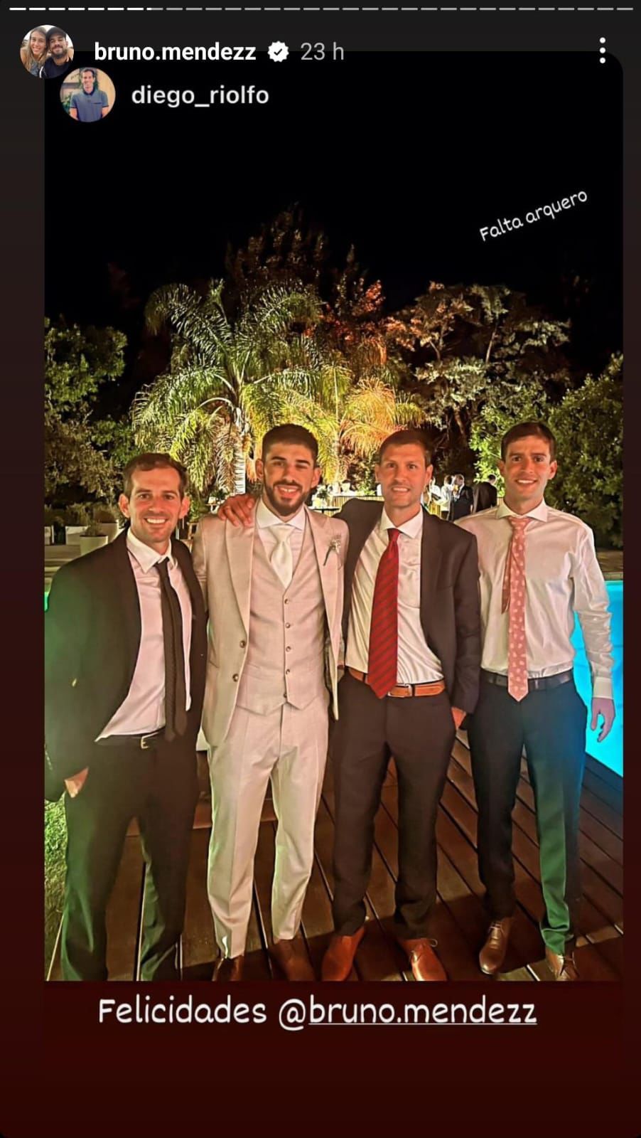 Este lunes, Bruno Méndez contrajo matrimonio con Catalina Olaso, y Francisco Ginella, actual jugador del plantel de Nacional, fue uno de los futbolistas invitados a la fiesta.