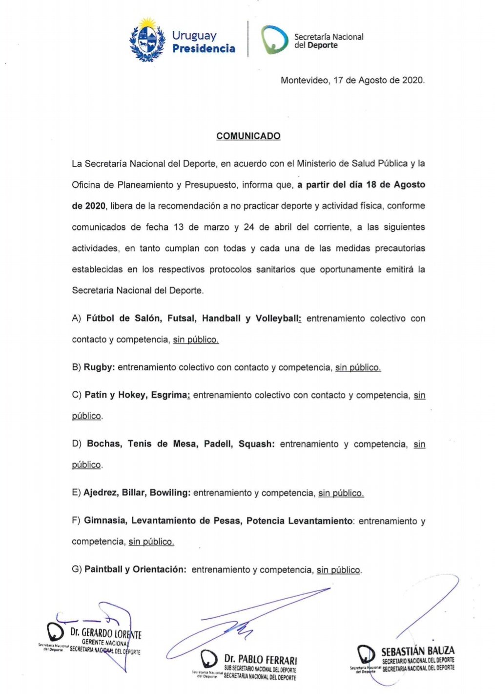 En el comunicado aclara que en conjunto "con el Ministerio de Salud Pública y la Oficina de Planeamiento y Presupuesto" informó de la liberación "de la recomendación a no practicar deporte y actividad física".