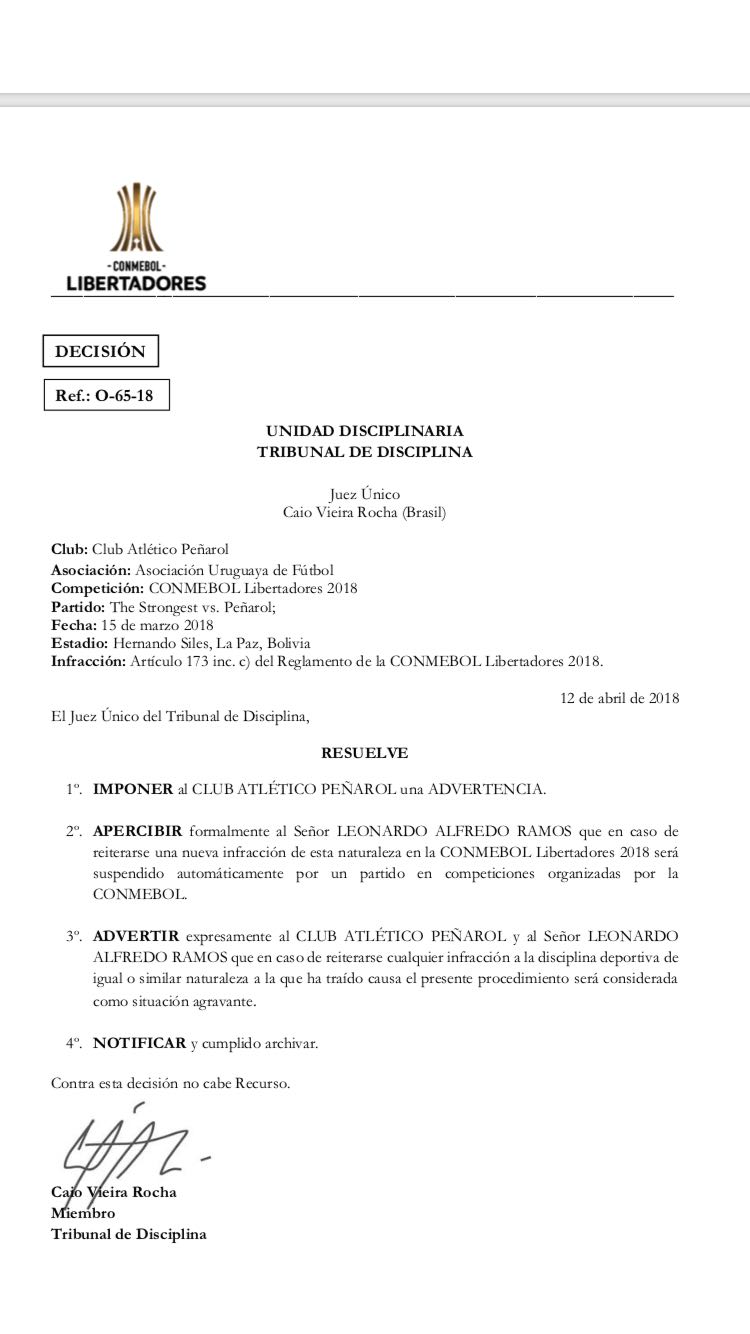 La Confederación Sudamericana de Fútbol (Conmebol), advirtió al técnico de Peñarol, Leonardo Ramos y a la institución por el ingreso tardío a la cancha en el duelo de Copa Libertadores que se disputó el 15 de marzo ante The Strongest en el Hernando Siles de La Paz.