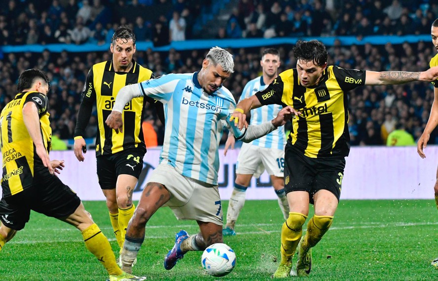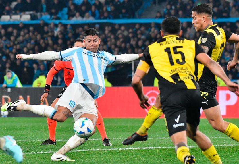A esa altura sufría el partido Peñarol, que si bien tenía espacios para contragolpear y fallaba en el último pase, pasaba demasiadas zozobras cerca de su área. Racing amplió la cancha con las subidas de los laterales y tuvo sitiado al conjunto mirasol, que no se mostró tan firme en defensa como en el partido de ida.