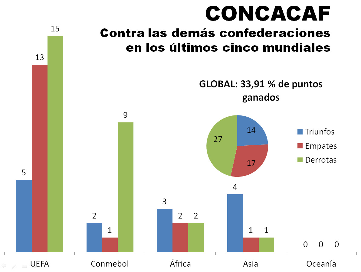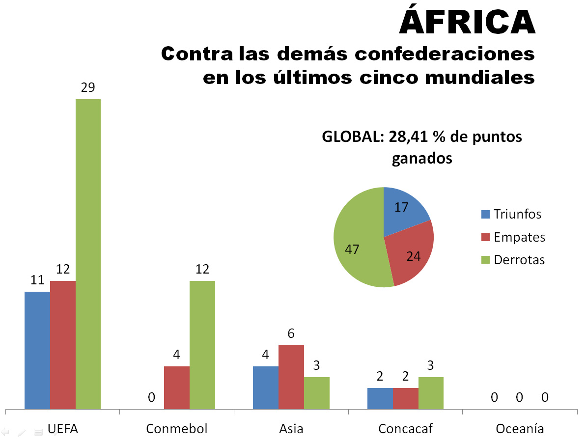 Las siguientes gráficas serán motivo suficiente para entender que, si esos continentes de escasa tradición futbolística reclaman más lugares en la Copa del Mundo, tendrán que buscar que se recorte por otro lado… al menos hasta que hagan méritos dentro de la cancha.