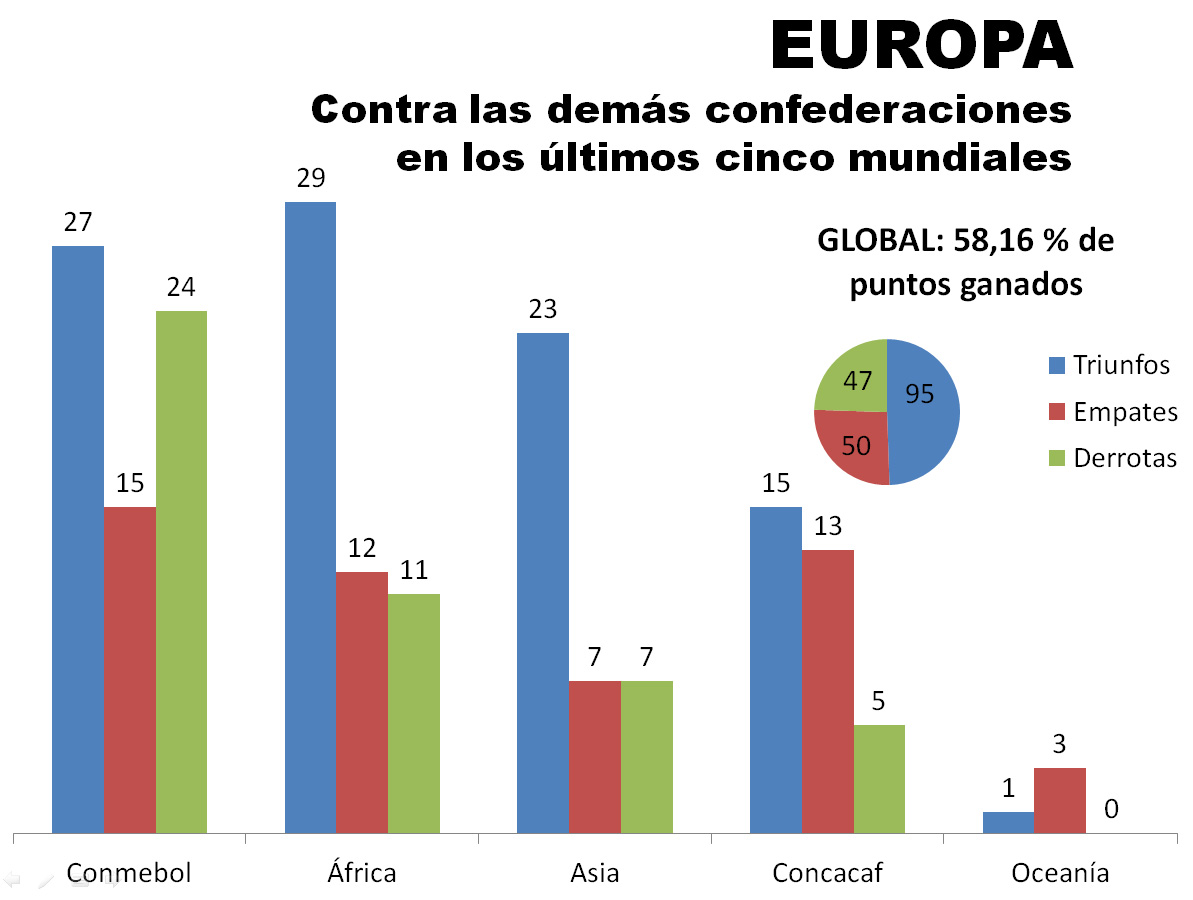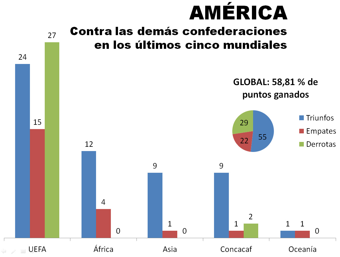 Más allá del reparto histórico de títulos, que marca que Europa ganó 11 y Sudamérica nueve, y de lo evidente que resulta decir que África nunca llegó a semifinales y que Asia sólo alcanzó esa instancia cuando Corea del Sur terminó cuarto en su Mundial de 2002, Montevideo Portal realizó una recopilación estadística que sitúa a la Conmebol al frente del historial de los cruces directos entre las distintas confederaciones en los últimos cinco mundiales.