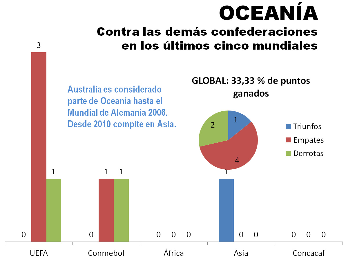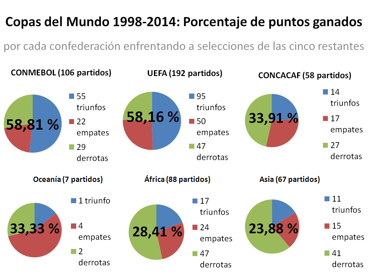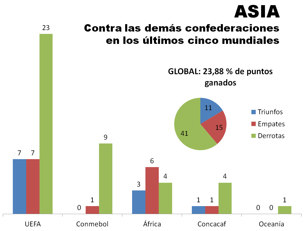 Tomando como punto de partida la Copa del Mundo de Francia 1998, por ser la primera que se jugó con 32 participantes y con un reparto de cupos similar al actual, y contemplando además el progreso que han evidenciado los países que no son potencias futbolísticas en los últimos 20 años, la conclusión es que el mayor porcentaje de puntos ganados lo tienen los sudamericanos, que además nunca perdieron con los asiáticos.