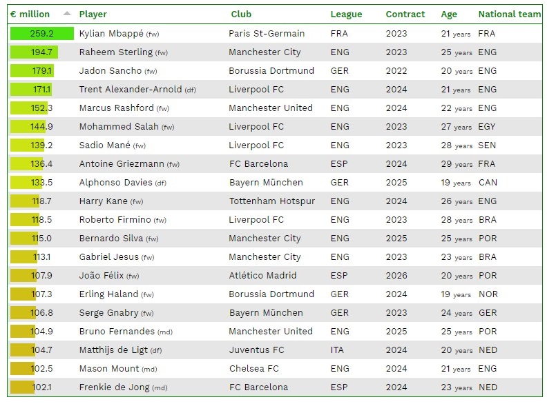 Kylian Mbappé, la joya de 21 años que disfruta el París Saint Germain, es quien encabeza la lista con amplia ventaja sobre el segundo, que es el inglés Raheem Sterling. El delantero francés tiene una cotización de 259,2 millones de euros, contra los 194,7 del extremo del Manchester City. Completa el podio el inglés Jadon Sancho, del Borussia Dortmund, con una cotización de 179,1.