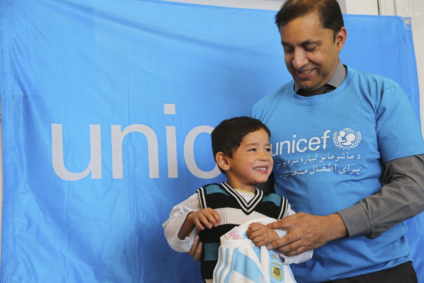 “Amo a Messi y mi camiseta dice que Messi me ama”, afirmó Murtaza tras recibir el regalo de su ídolo, según la nota de Unicef.