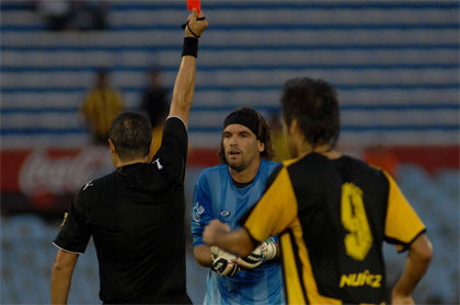 Expulsión de Germán Caffa, arquero de Nacional de Asunción. Foto: MVD Sport.