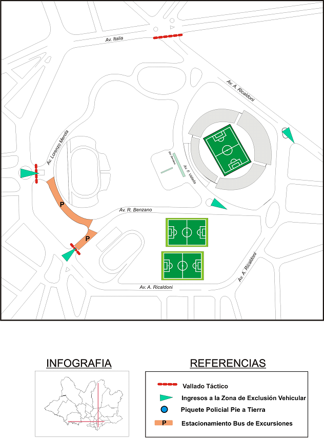 El resto de los espectadores deberá estacionar fuera de la zona de exclusión, salvo en Avenida Italia en el tramo comprendido entre Avenida Centenario y Francisco Simón, ya que en esa zona estacionarán los ómnibus de transporte capitalino.