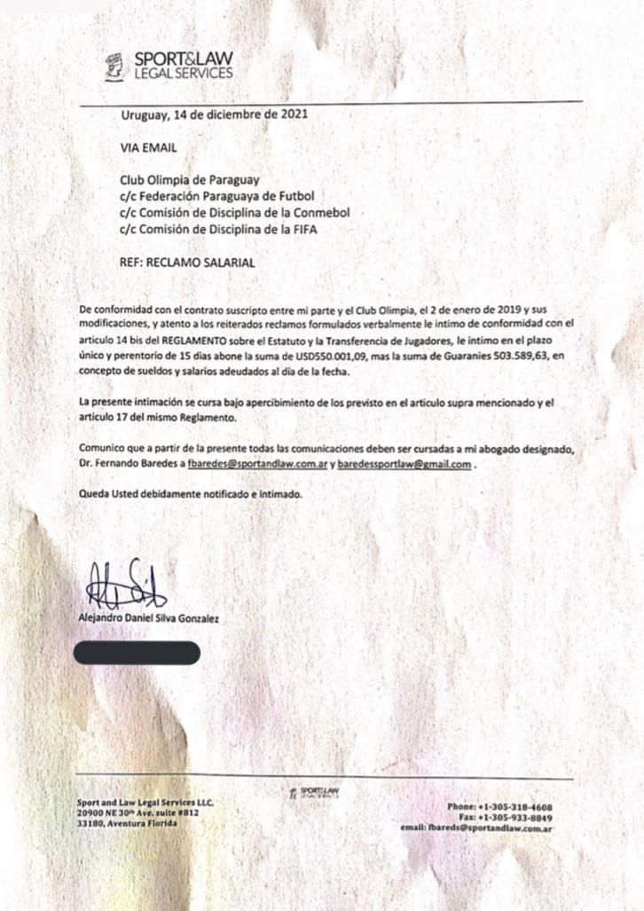 El documento escrito por el futbolista cita: “De conformidad con el contrato suscripto entre mi padre y el Club Olimpia, el 2 de enero de 2019 y sus modificaciones, y atento a los reiterados formulados verbalmente le intimo de conformidad con el artículo 14 del REGLAMENTO sobre el Estatuto y la Transferencia de Jugadores, le intimo en el plazo único y perentorio de 15 días la suma de U$D 550.001,09, más la suma de Guaraníes 503.589,63, en concepto de sueldos y salarios adeudados al día de la fecha”.