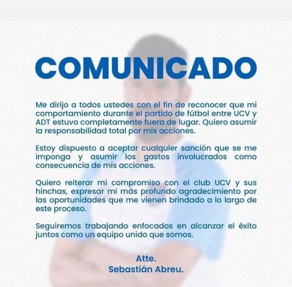 Abreu, se pronunció sobre su comportamiento y expresó: “me dirijo a todos ustedes con el fin de reconocer que mi comportamiento durante el partido de fútbol entre UCV y ADT estuvo completamente fuera de lugar. Quiero asumir la responsabilidad total por mis acciones” comienza el pronunciamiento del entrenador.