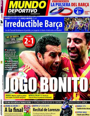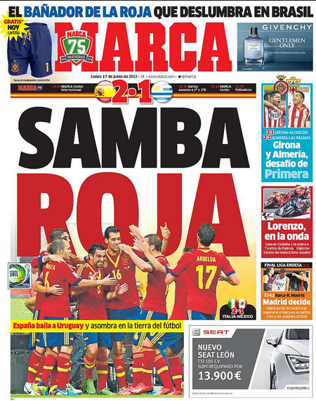 “Abran paso a la Rojinha”, tituló Marca en su edición digital, y “Samba Roja” fue el titular de su portada de papel, que asegura que el equipo de Vicente Del Bosque “despertó admiración en su presentación en la Copa Confederaciones de Brasil con un fútbol preciosista que maravilló a los aficionados locales. La campeona del mundo lo bordó, sobre todo en una primera parte primorosa en la que descosió por completo a un hueso duro como Uruguay”.