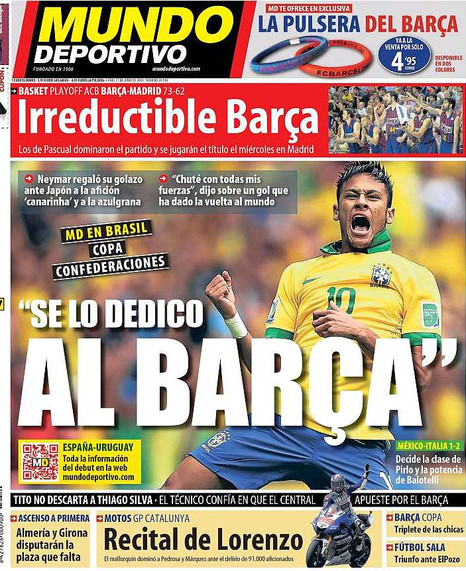 Tanto Mundo Deportivo como Sport, también catalán, resaltaron la cantidad de jugadores del Barcelona en la selección que busca su primera Copa de las Confederaciones. “Los siete blaugranas que fueron titulares en Recife impusieron su sello para prácticamente ridiculizar a los campeones de América con goles de Pedro y Soldado. Uruguay solo maquilló el marcador al final con un golazo de falta de Luis Suárez”, sostuvo Sport.