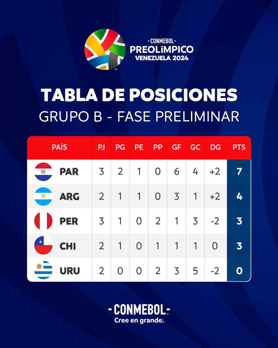 Paraguay lidera con 7 puntos y tiene fecha libre, mientras que Argentina suma 4, Chile 3, Perú 3 y Uruguay está último con cero. Los dirigidos por Marcelo Bielsa enfrentarán mañana desde las 17:00 horas a Perú y a las 20:00 se verán las caras albicelestes y trasandinos.