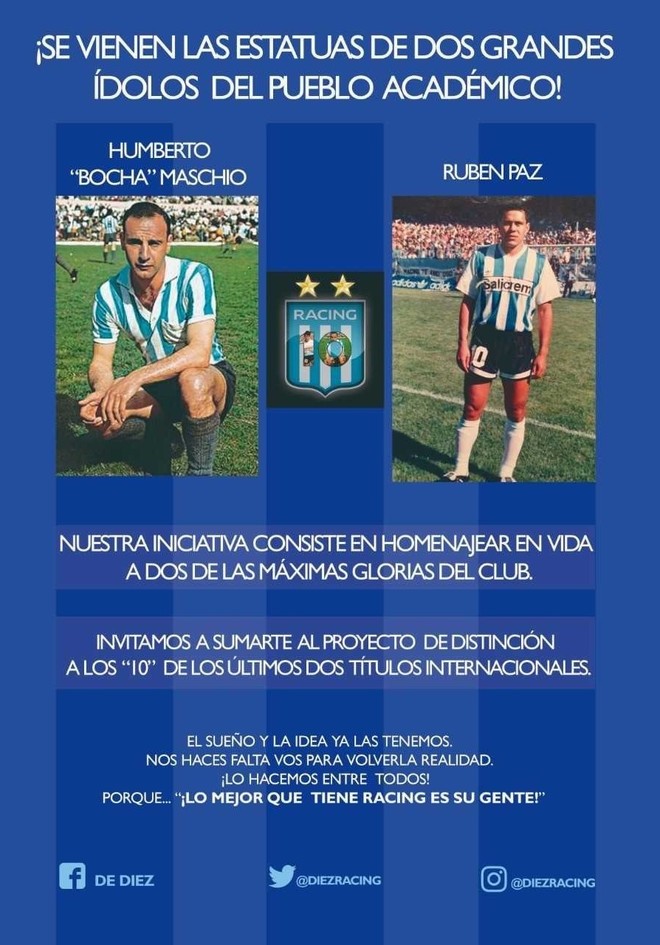El colectivo de hinchas, denominado "Racingde10" contó sobre la iniciativa en entrevista del diario "Olé" y mencionaron: "la idea es homenajear en vida a dos de las máximas glorias del club, con un pasado de excelencia futbolístico indiscutible y que además tienen el amor incondicional de los hinchas actualmente".
