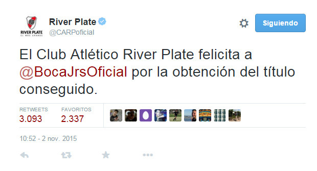 Lo llamativo ocurrió poco antes de las 11 de la mañana, cuando River Plate felicitó a los xeneizes a través de su cuenta oficial en Twitter.