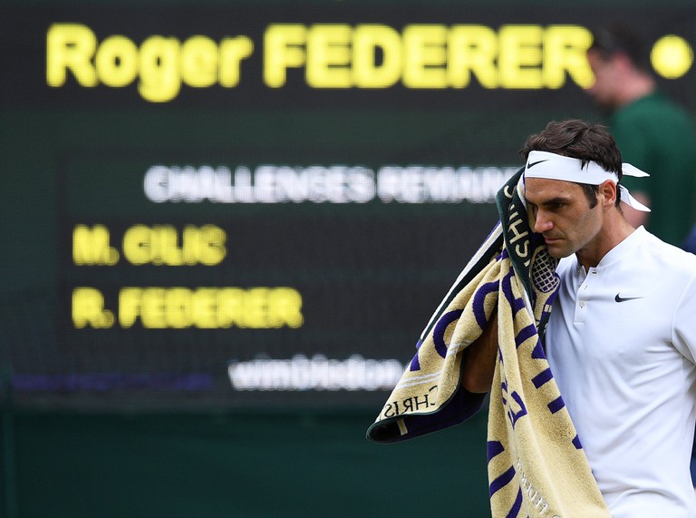 Parecía que iba a retirarse, pero saltó de nuevo a la central tras una gran ovación del público. Luego, actuó disminuido ante Federer, que no tuvo compasión.