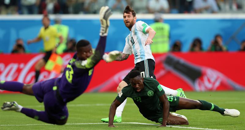 El tiro libre, volcado sobre la izquierda, lo pateó Messi al palo del golero. Uzoho llegó a tocarla y la pelota dio en el vertical, salvando a Nigeria del 0-2 en contra.