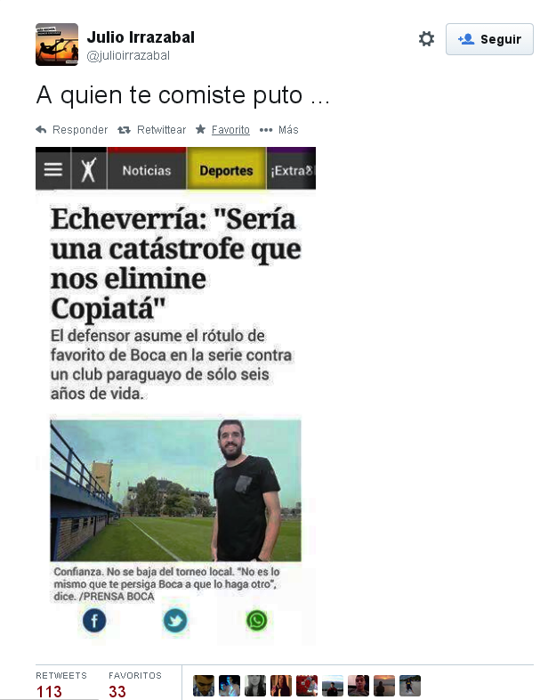 El lateral derecho del Deportivo Capiatá, Julio Irrazabal, contestó a través de su Twitter a las declaraciones de un jugador de Boca que tildó de "catástrofe" una posible eliminación de la Sudamericana ante el equipo paraguayo.