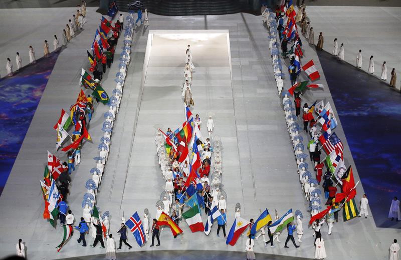 Por su parte, la bandera de los deportistas ucranianos, cuyo país vivió ayer el triunfo de una revolución popular, fue enarbolada con un crespón negro en recuerdo de los caídos.