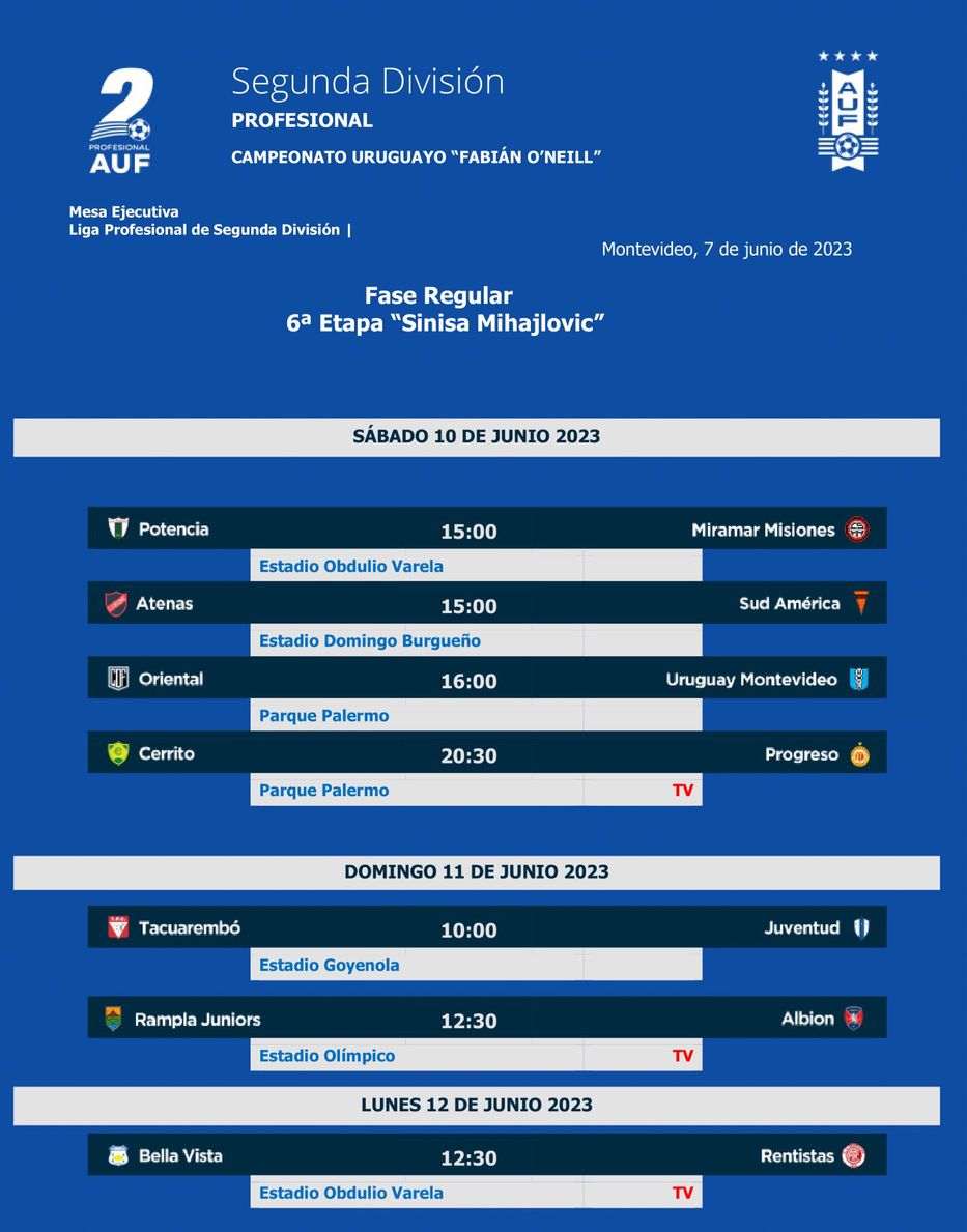 El domingo continuará la fecha a partir de las 10 de la mañana con el encuentro entre Tacuarembó y Juventud en el estadio Goyenola, mientras que Rampla Juniors recibirá a Albion a la hora 12:30 en el estadio Olímpico (partido que se podrá observar a través de la televisión).