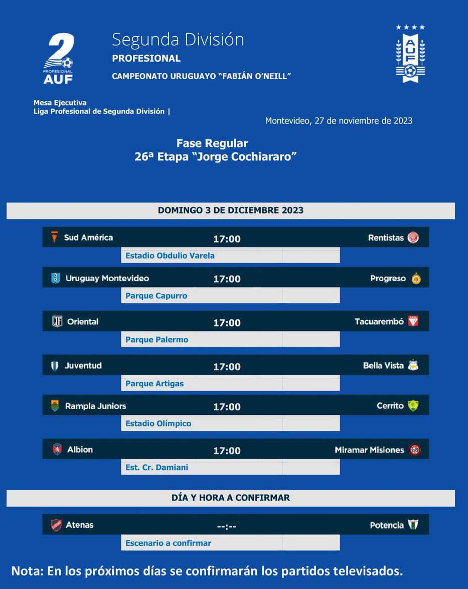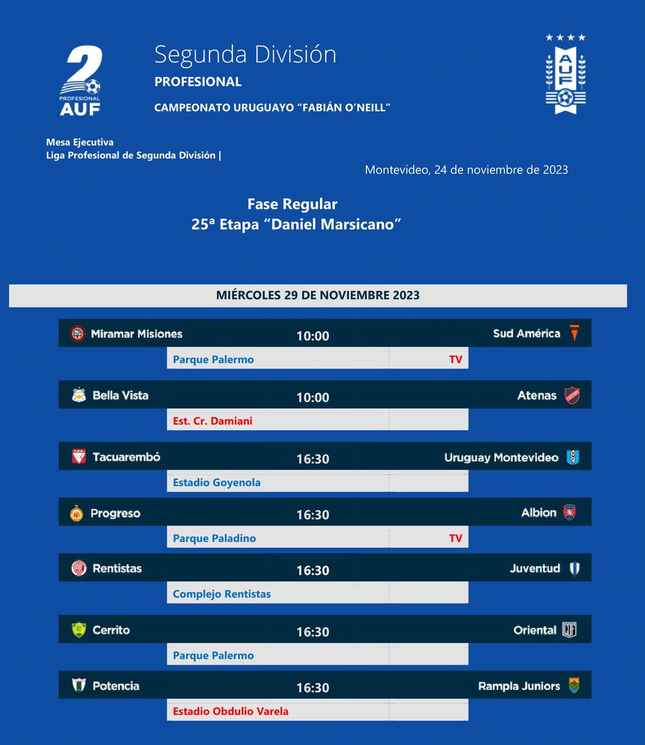La jornada número 25 se abrirá a las 10 de la mañana con dos partidos: Miramar Misiones recibirá a Sud América en el Parque Palermo (choque televisado) y Bella Vista a Atenas en el estadio Contador Damiani.